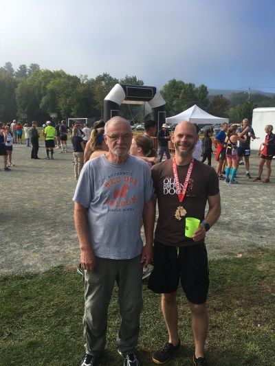 Most of his recent involvement in running has involved spectating and race support. Aside from showing up to cheer me on at a handful of my annual races, he’s spent the last several years closely following the progress of his two grandsons as they’ve steadily made their way up the ranks of their high school cross country team. A few weeks ago, he was thrilled to watch his oldest grandson Gabe run in the high school state meet in Hershey, Pennsylvania.